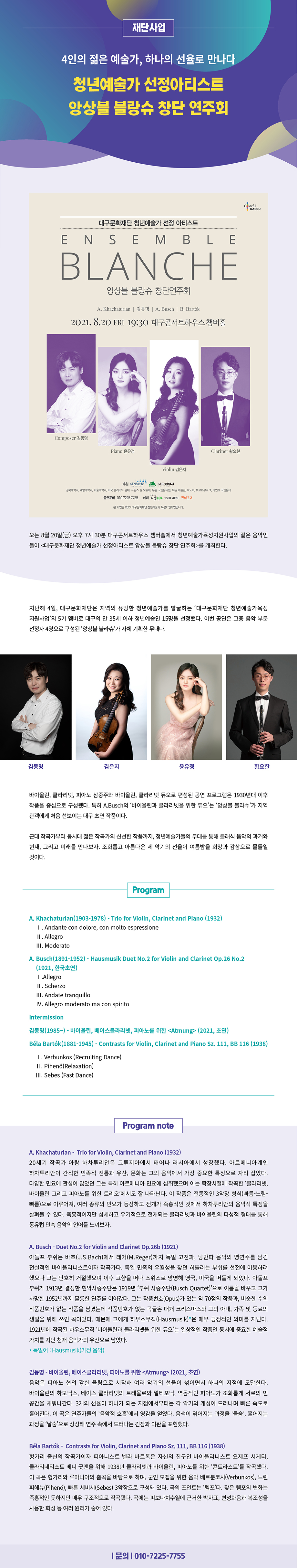 [재단사업] 4인의 젊은 예술가, 하나의 선율로 만나다 청년예술가 선정아티스트 앙상블 블랑슈 창단 연주회